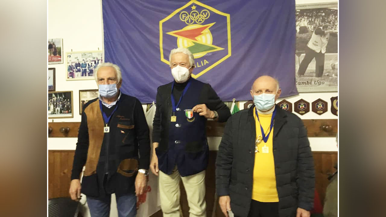 Il podio dell’Assoluta: Luciano Persici, Luca Biagini e Mario Sabbi. A premiare la delegata regionale Fitav Sara Fanciullacci – Foto Fitav Toscana