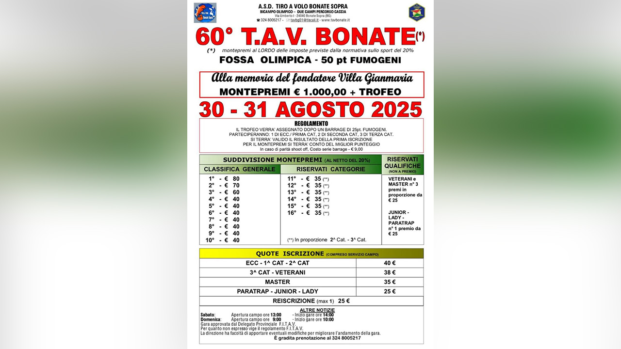Sarà aperta alle categorie Eccellenza, Prima, Seconda e Terza e alle qualifiche Veterani e Master la gara di fossa olimpica su 50 piattelli fumogeni organizzata dal Tav Bonate Sopra (Bg) in memoria di Gianmaria Villa, fondatore di questa struttura che si trova in provincia di Bergamo che quest’anno celebra un traguardo importante: 60 anni di attività. Il Trofeo verrà assegnato dopo un barrage su 25 piattelli, sempre fumogeni. Ma ora un po’ di storia… Quella del Tav Bonate è iniziata nel 1965, quando la locale Sezione Cacciatori, presieduta da Gianmaria Villa, realizzò un quagliodromo proprio sul greto del fiume Brembo, nella frazione Ghiaie, nel territorio di Bonate di Sopra. In un secondo momento si pensò anche al primo campo per il tiro al piattello con una sola macchina a sgancio manuale. Sempre nel corso del 1965 furono installate altre 4 macchine lanciapiattelli così da ottenere la possibilità di svolgere gare Fitav (Federazione italiana tiro a volo). Nel 1969 la Sezione Cacciatori acquistò un terreno a Bonate Sopra che poi donò al comune e stipulò una convenzione della durata di 99 anni. Qui fu realizzato l’attuale Tav dove, fra le discipline che si potevano praticare, la fossa olimpica e lo skeet. Negli anni ‘80 fu realizzata la prima fossa olimpica e vennero ristrutturati i campi da skeet, vennero inoltre effettuati lavori per alzare la “collinetta” a protezione delle case e delle attività del paese. che nel frattempo era cresciuto. Grazie all’esperienza acquisita in quel periodo i tiratori di Bonate conquistavano risultati importanti nelle manifestazioni nazionali. Alla fine degli anni ’90 lo skeet venne sostituito da 2 campi per il percorso di caccia e da un altro per la fossa olimpica. Nel corso del tempo le strutture del Tav Bonate Sopra sono cambiate e sono cresciute insieme con tutti gli impianti e adesso possiamo trovare: un’armeria esterna, il bar, la segreteria, i servizi igienici e una zona relax. Oggi gli impianti di tiro sono dotati delle tecnologie più moderne e viene dedicata molta attenzione all’elettronica che permette di svolgere anche prove in notturna.