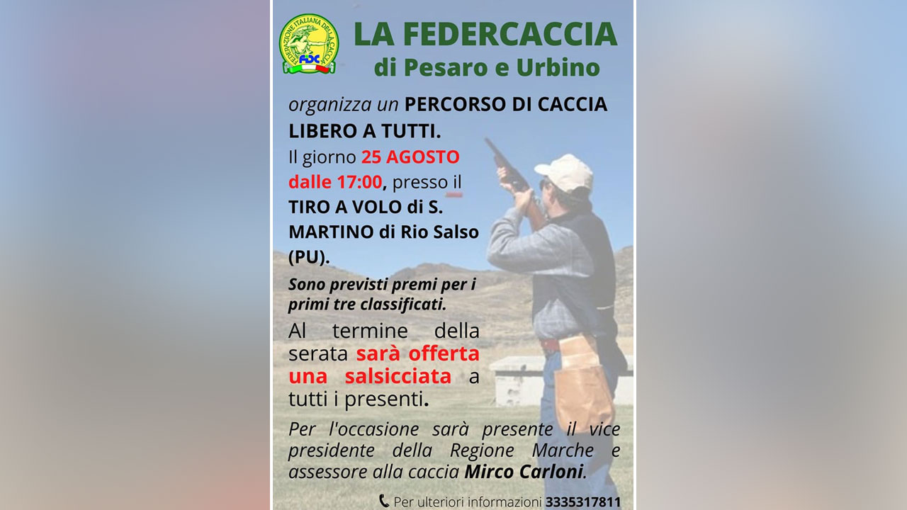 Tenuta a battesimo e orchestrata dalla Federcaccia di Pesaro e Urbino, nella giornata di giovedì 25 agosto si terrà la gara di percorso di caccia aperta a tutti. Dove? Sulle ospitalissime pedane del Tav San Martino TOP a Rio Salso (Tavullia). Un’occasione per divertirsi, come sempre quando a confrontarsi ci sono sia tiratori che cacciatori e per partecipare a una serata conviviale alla quale presenzierà anche il vice presidente della Regione Marche, nonché assessore alla Caccia, Mirco Carloni. Si sta infatti avvicinando la stagione venatoria e pertanto sarà un motivo in più per apprendere dall’assessore se ci sono novità riguardanti il calendario 2022/2023. Per maggiori informazioni: cell. 333/5317811.