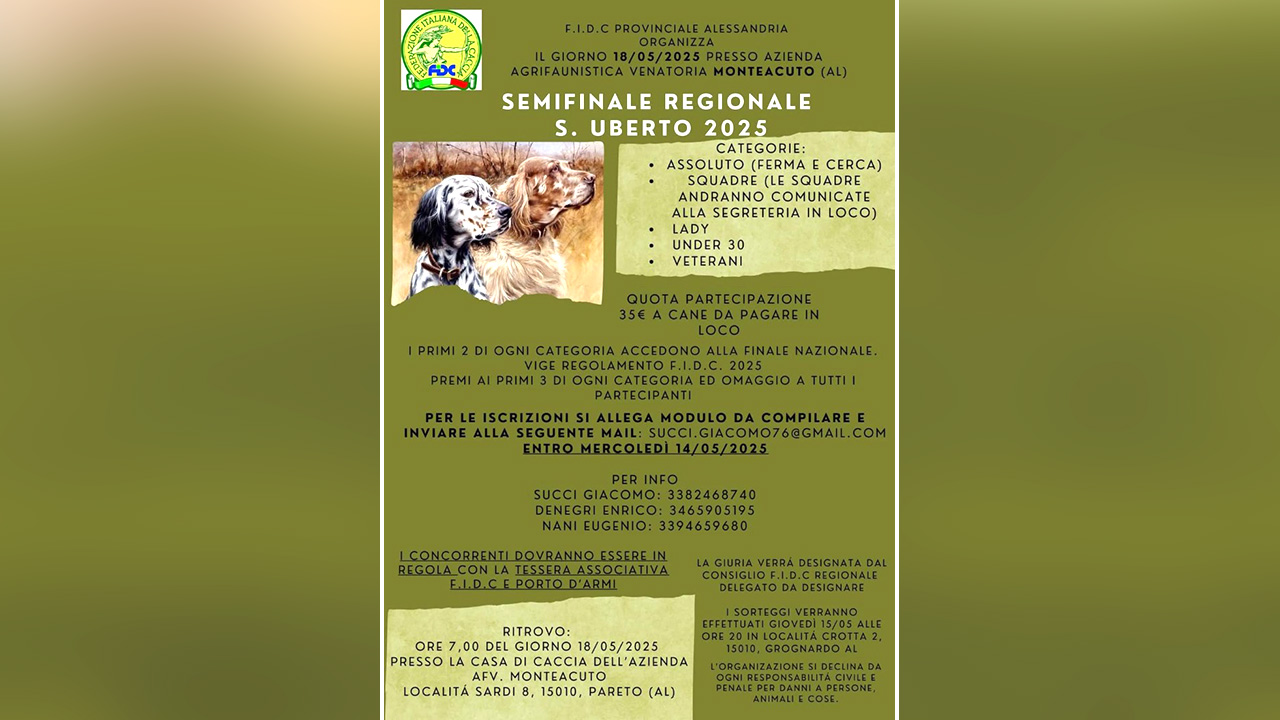 Domenica 18 maggio 2025 l’azienda agrofaunistico venatoria piemontese “Monteacuto” in provincia di Alessandria ha ospitato la semifinale regionale del Campionato Sant’Uberto, organizzata dalla sezione provinciale della Federazione italiana della caccia. Abbiamo sentito Antonio Tani, responsabile delle attività sportive di Fidc Piemonte, che ci ha detto: “La prova di Monteacuto ci ha regalato non poche soddisfazioni, l’azienda che ci ha ospitato si è dimostrata davvero all’altezza della situazione grazie alla gestione di Fabrizio e Barbara, selvaggina e terreni erano davvero validi. Devo sottolineare che le zone che abbiamo scelto per le finali non saranno certo dei biliardi e bisogna arrivare preparati all’appuntamento. Ottima la preparazione degli accompagnatori che hanno dato a tutti la possibilità di incontrare la selvaggina. La giornata era soleggiata e ventilata, perfetta per una semifinale regionale del campionato più importante per gli appassionati di cinofilia. Devo fare i complimenti anche al giudice Stefano Ferrero per la preparazione e la professionalità espressa durante i turni e nei giudizi. L’organizzazione è stata curata nei dettagli da Giacomo Succi e dal presidente della sezione Fidc di Alessandria, Diego Lazzari”.